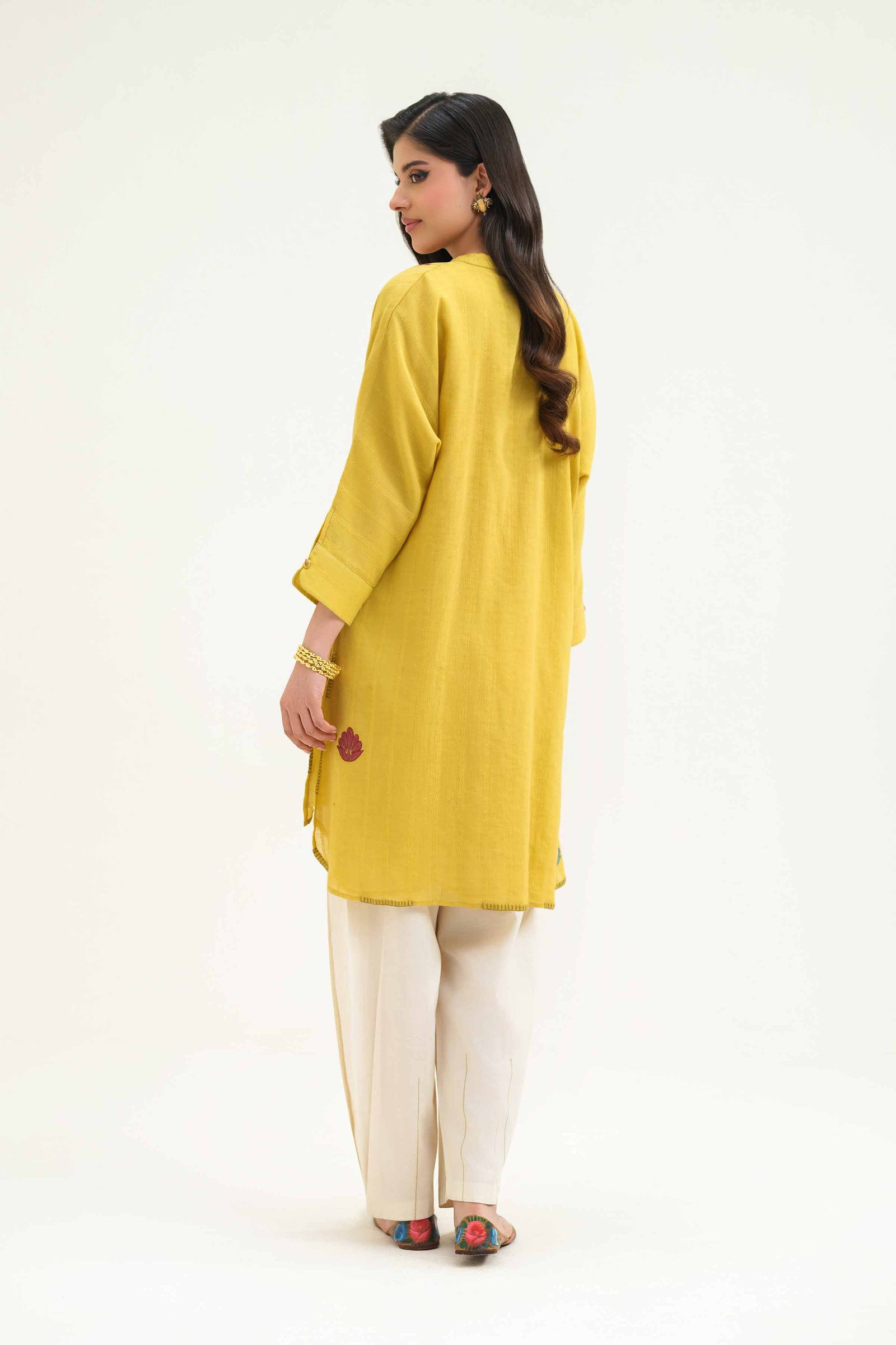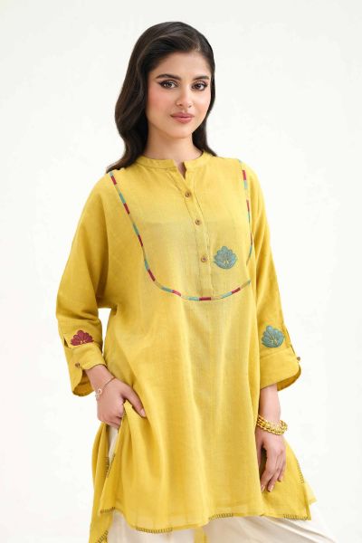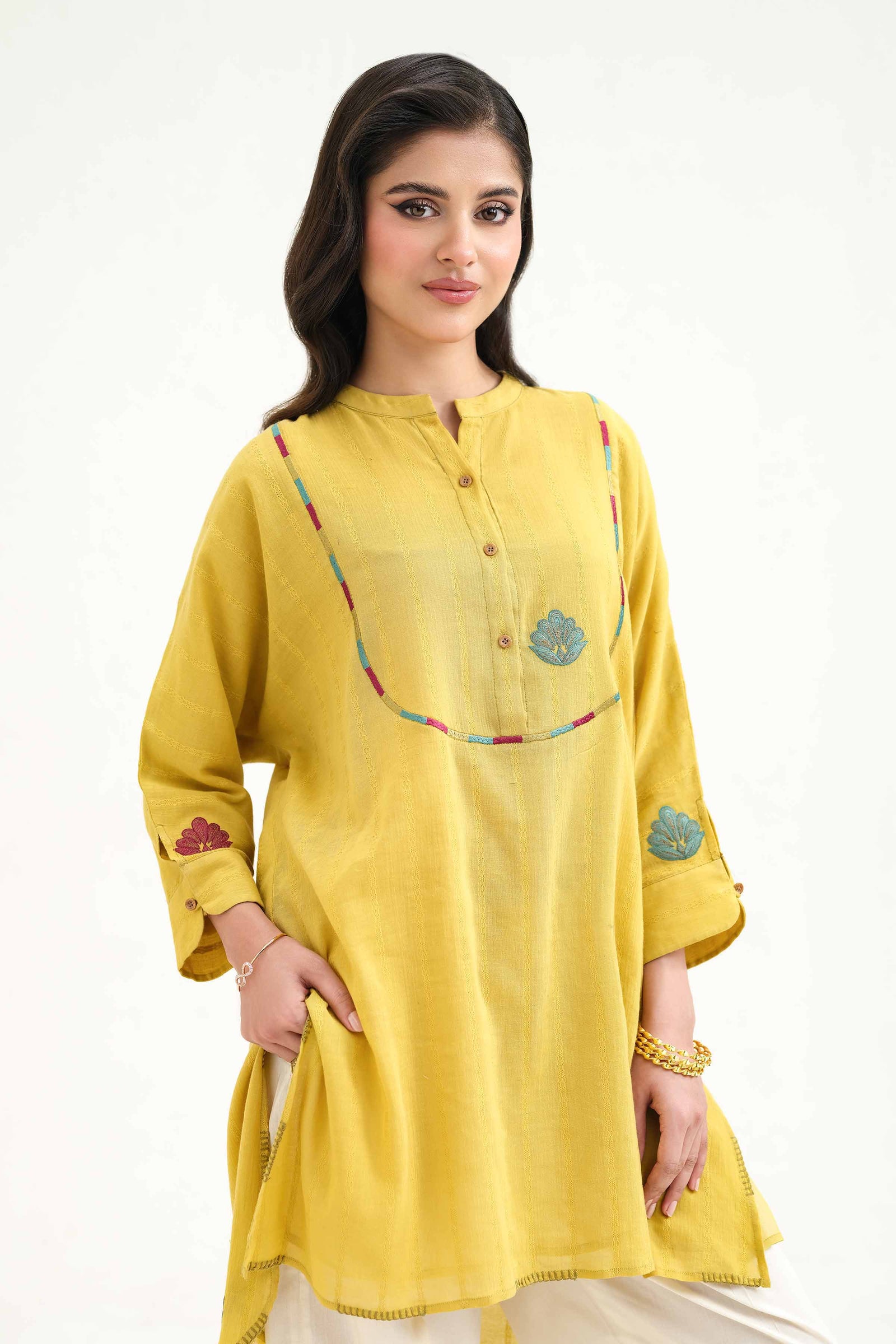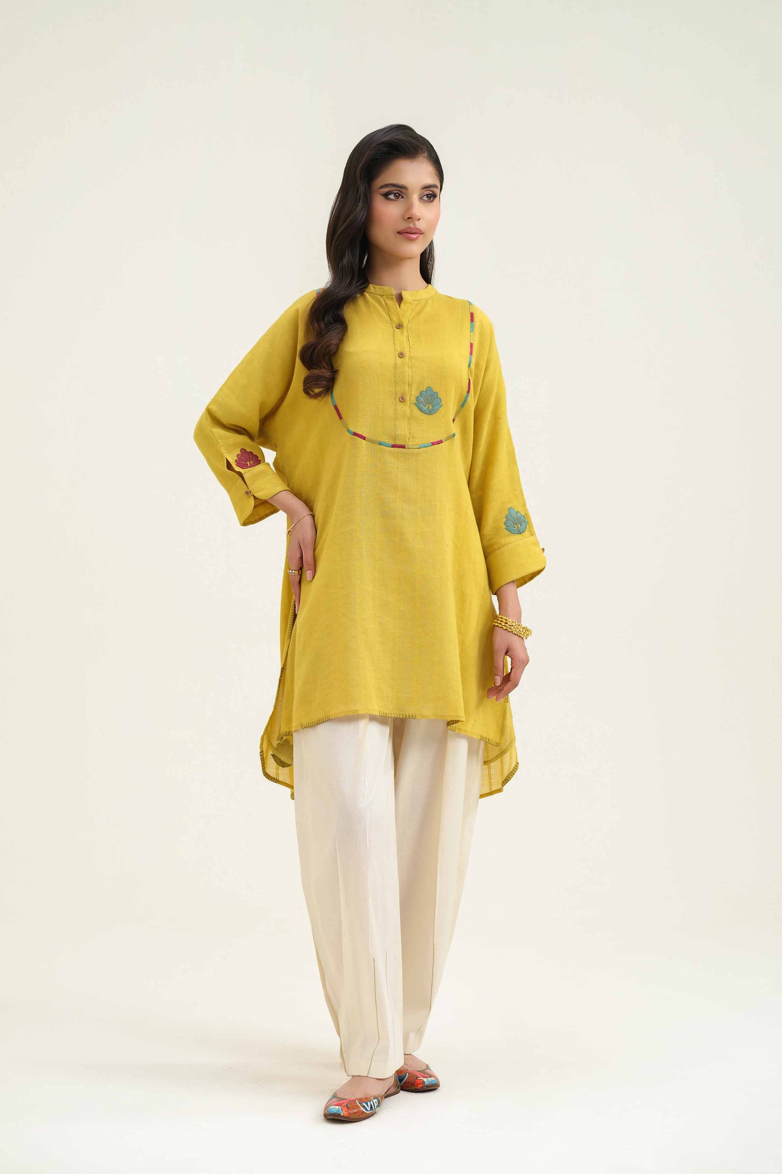 Band Neckline With Placket, Cuffed Sleeves With Embroidered Patch Motif, Round Hem Finished With Blanket Stitch, Kimono Short Shirt