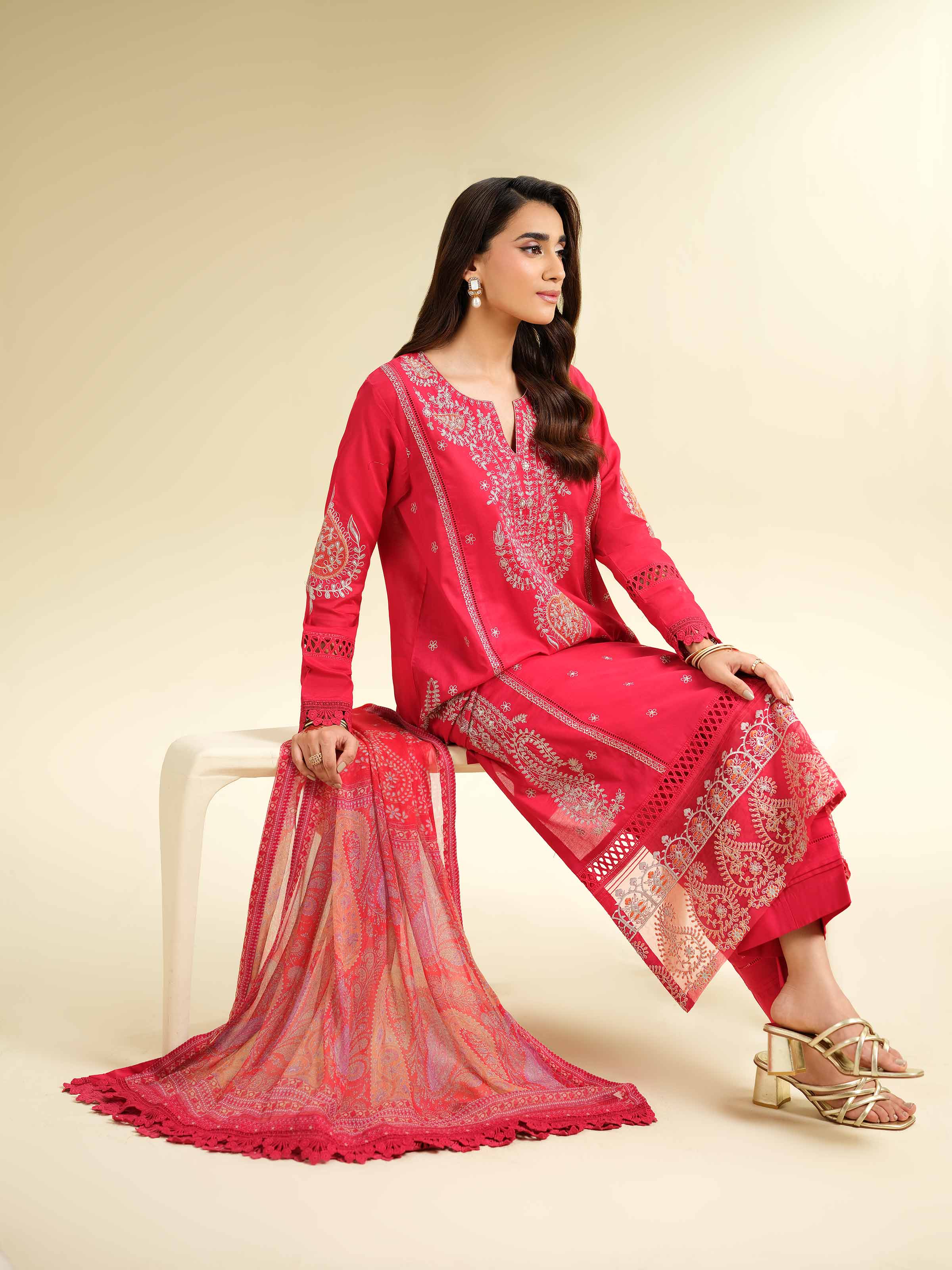 Perfect your look with this beautifully crafted embroidered three-piece from the latest unstitched summer collection.